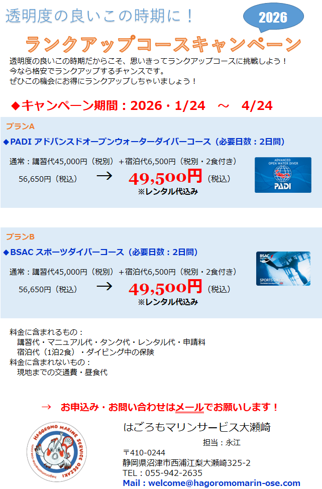 投稿日: 2026年1月16日2026年1月16日 投稿者: hagoromo🐳ランクアップをお考えのあなたへ🪸 🔊冬に潜ってこそ!ダイバー❄️ 詳細・ご予約について、ご予約フォーム、メールにてお願い致します。